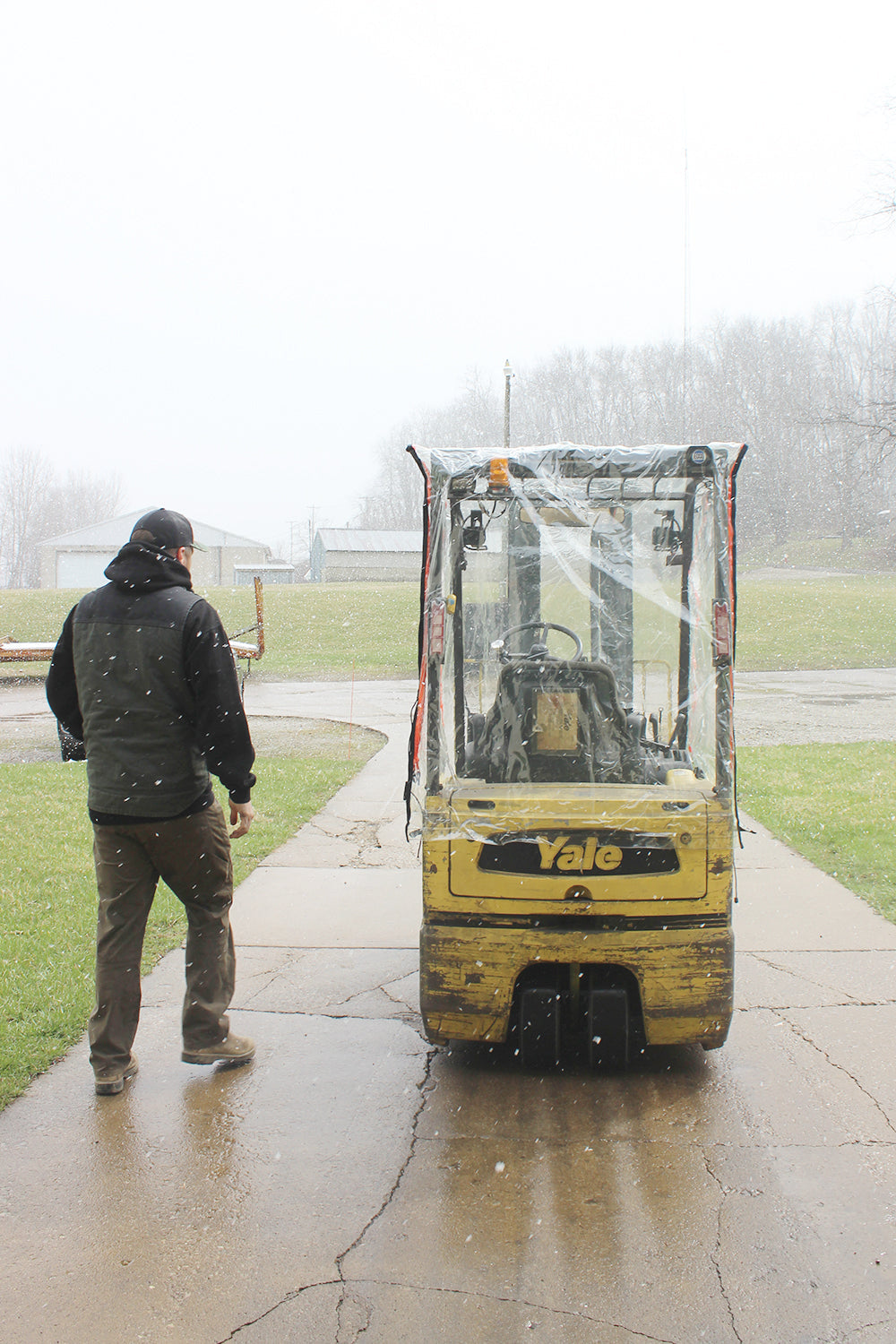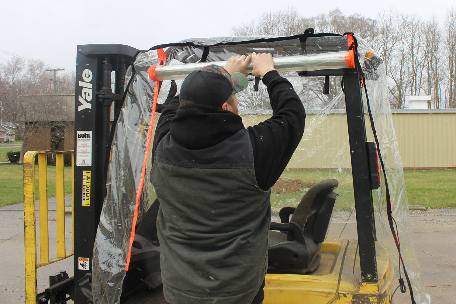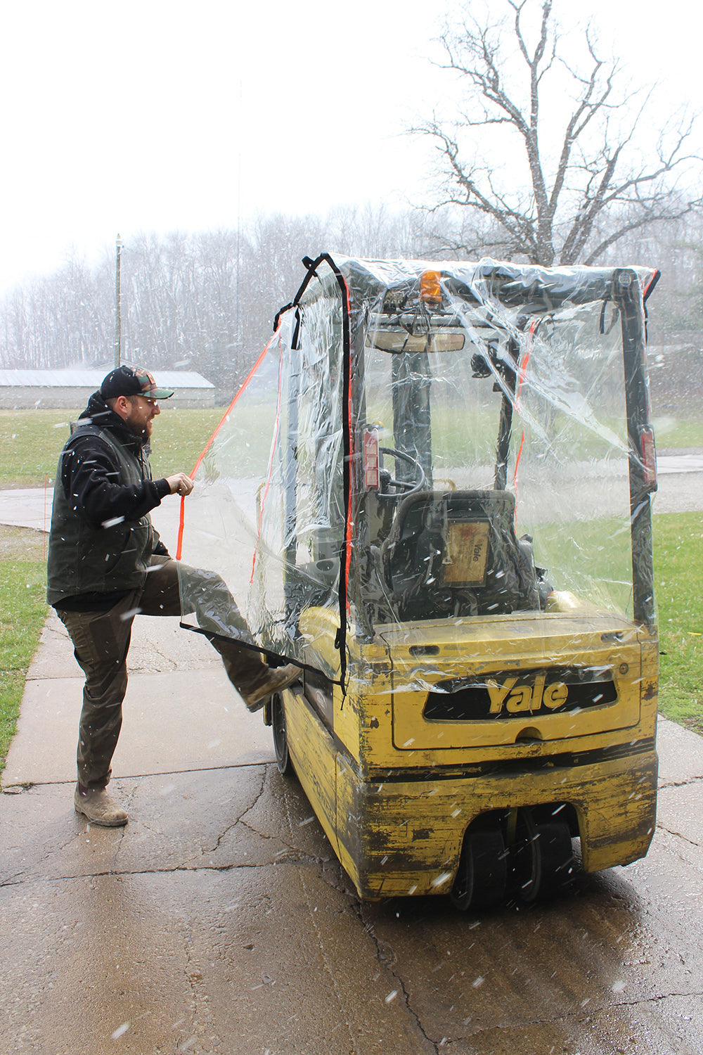 Our Full Cab Forklift Enclosure will attach easily to any forklift in seconds. Our universal Standard Size cover will fit virtually any lift below 6,000 lbs.